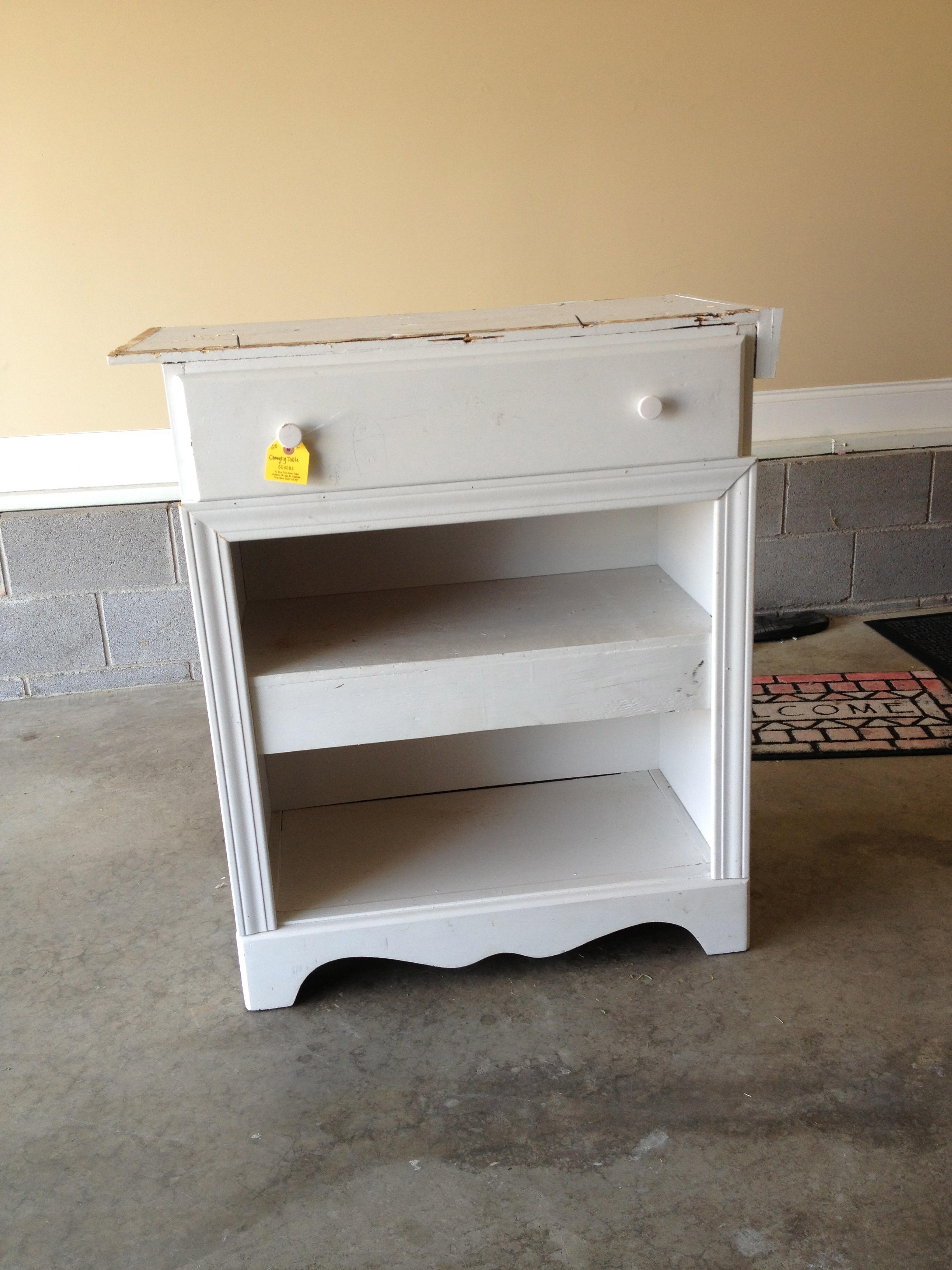 This is my new desk that I made recently. It started out as a $19 baby changing table from the thrift store. Unfortunately, in my excitement, I forgot to take the “before” picture before I tore off the box part on top. (You know, those side pieces that keep the baby from rolling off.)