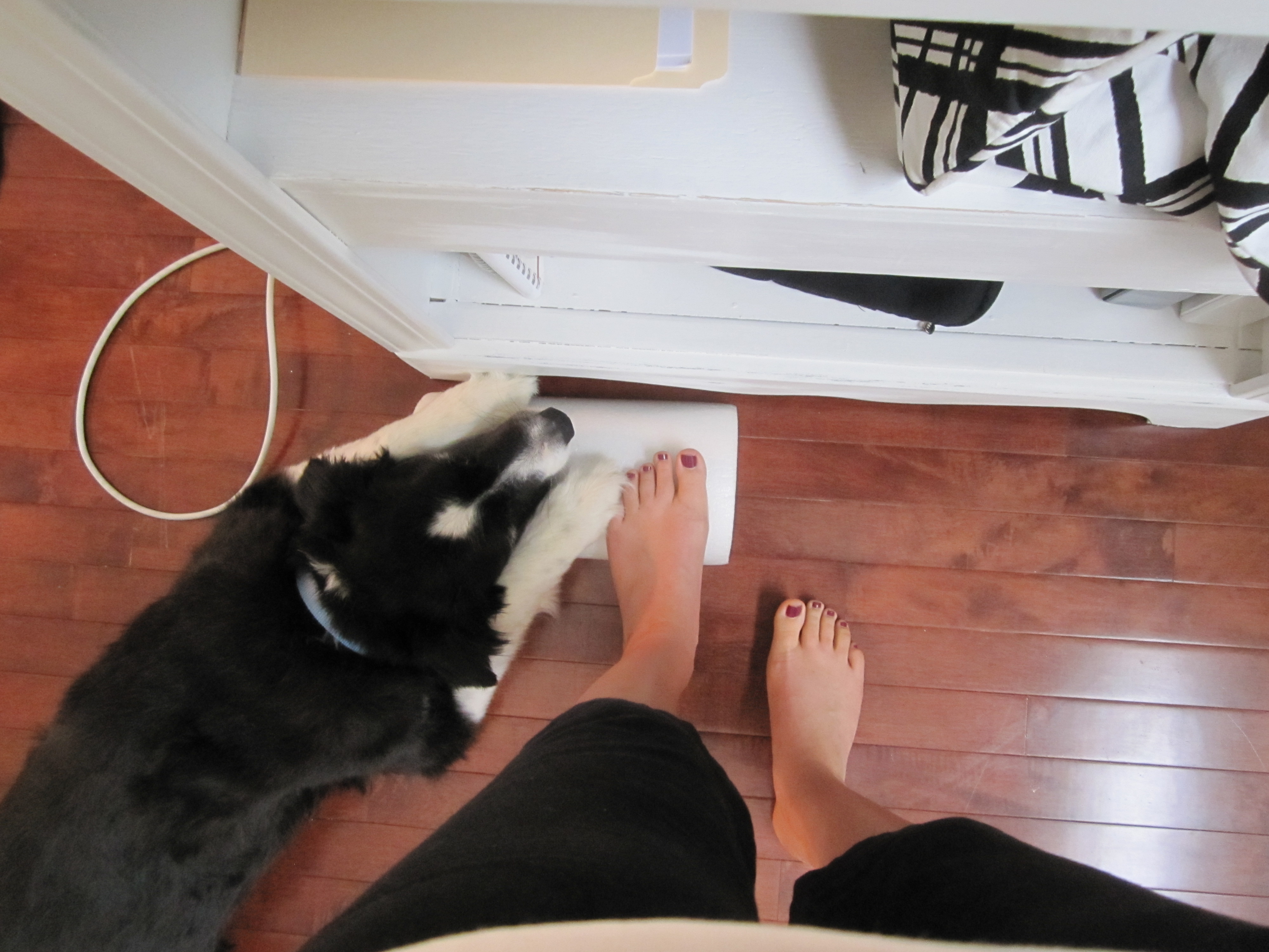 I like to multi task by stretching my calves while I work. My dog likes to be RIGHT next to me all the time. Sometimes it ends up looking like this.