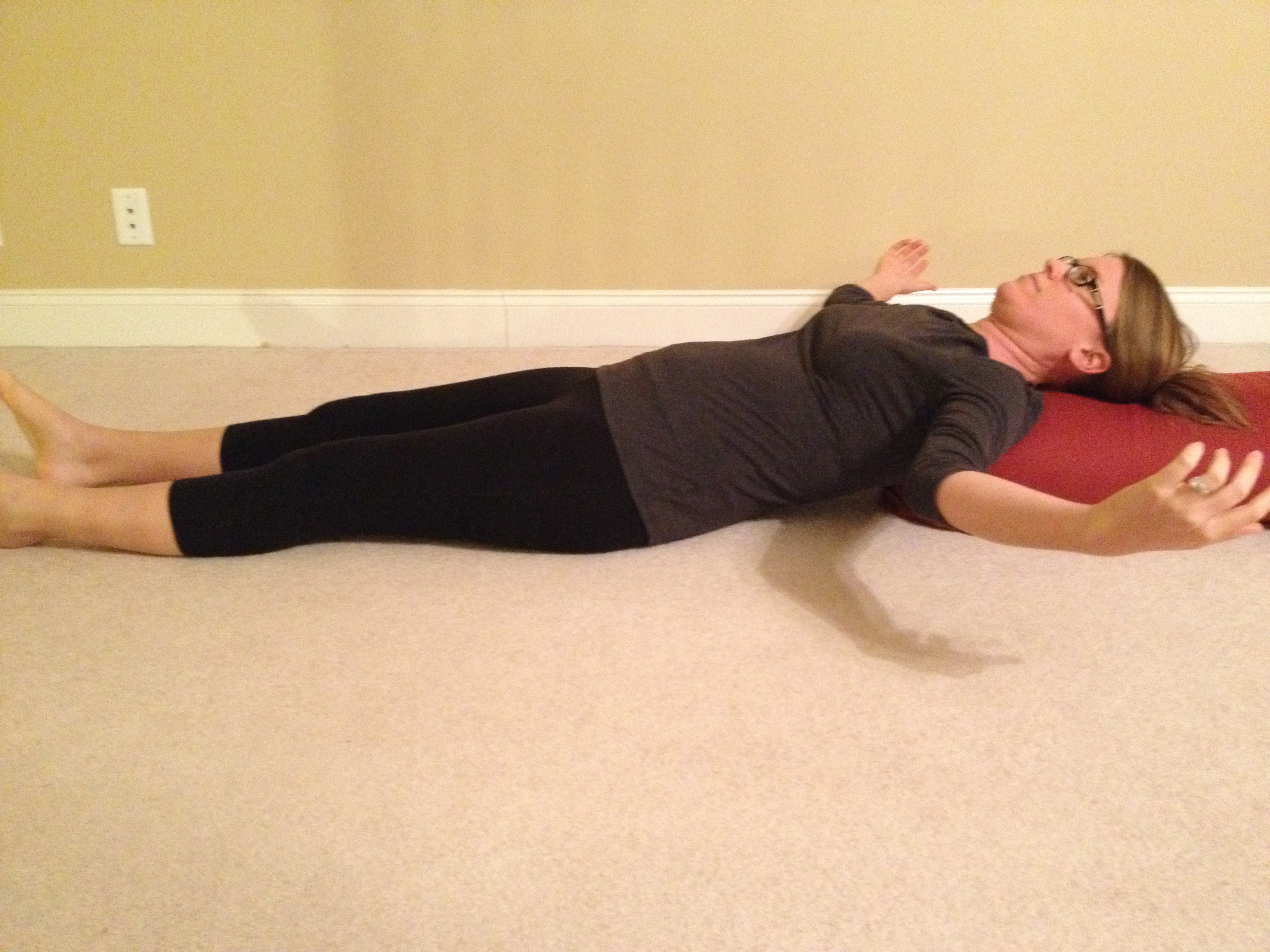 First, elevate your head and shoulders and relax here until your ribs start to relax down towards the floor. You can let your arms rest on the ground by your sides. This helps relax a muscle called the psoas.