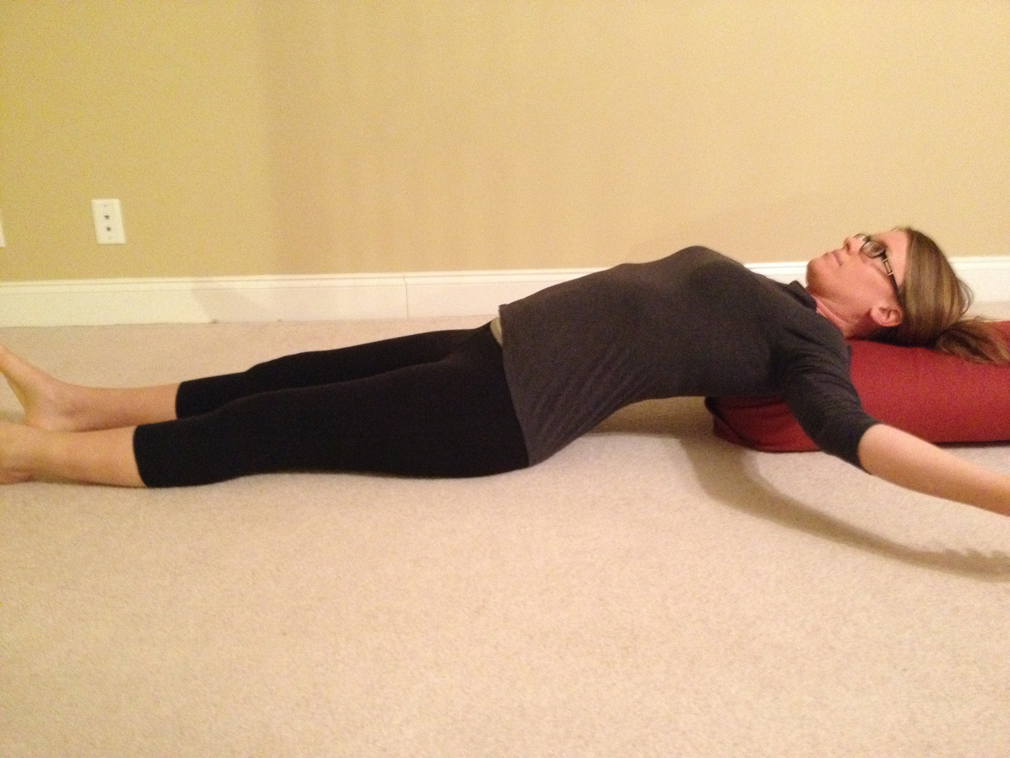 Next: After several minutes, add SLOW arm motions like you are making a snow angel without letting the ribs pop back up towards the ceiling. Rotate the arms so that your thumbs are closer to the floor than the pinkies. This will stretch the chest and shoulders.