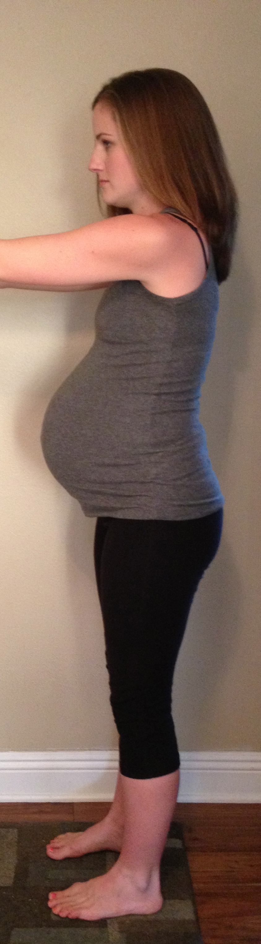 A pregnant woman who stands like Picture A will likely have more back pain, but alignment affects more than whether or not she is in pain. I’d like you to notice two very important things: the shape of her belly and the shape of her rear end. It’s ok, I asked her permission to have a bunch of strangers (although, let’s be honest, not that many) analyzing her very pregnant figure. Can you see that both her belly and her backside are completely different shapes in the two different pictures? In the typical pregnancy posture (Picture A) her rear end is flattened out and looks smaller. Her belly is sort of pointing upwards. In the aligned picture, you can see her gluts look bigger (in a good way) and her belly is pointing straight ahead.